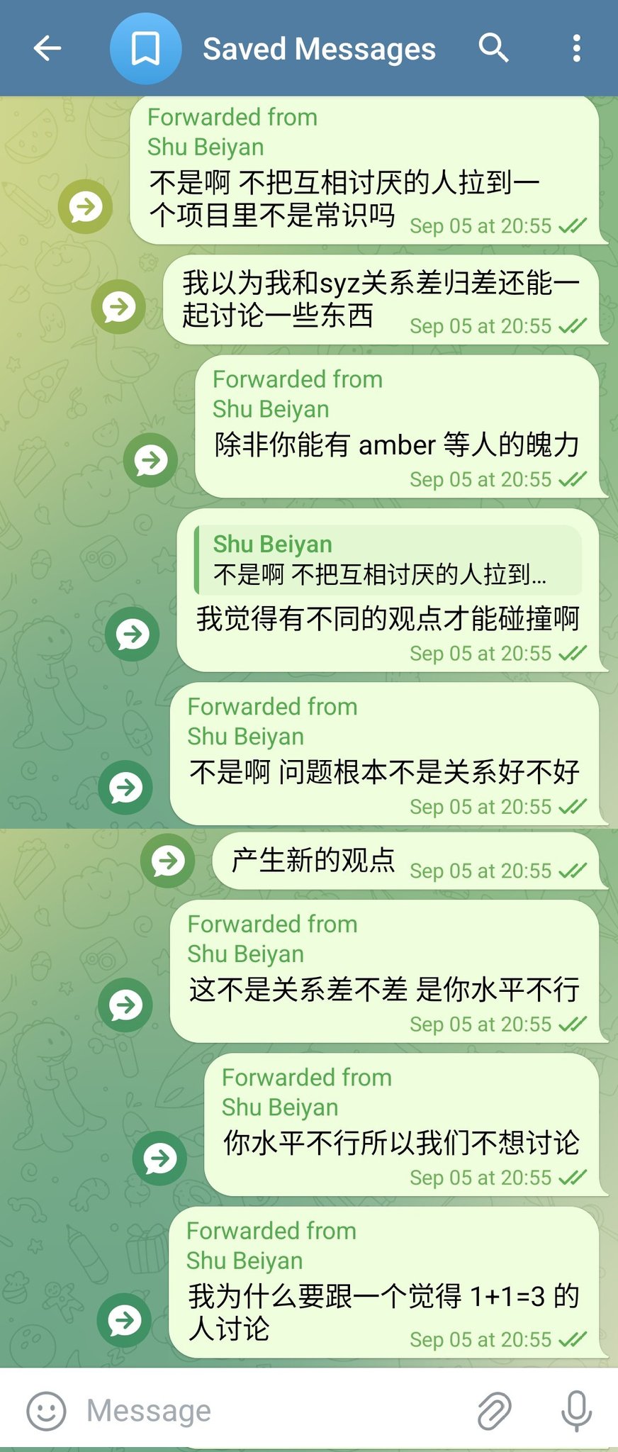 2、在云清称别人“典型公跨”后,Amber决定自我停职,于是书打算夺权,未果后和Amber吵了一架,并且牵扯到了我,书重复了对我的评价,还说Amber“骂她骂得真难听”,而Amber表示“我把你做的事情重复了一遍”。这部分的聊天记录有比较好的保存下来。聊天记录太多,我上传到了Google drive