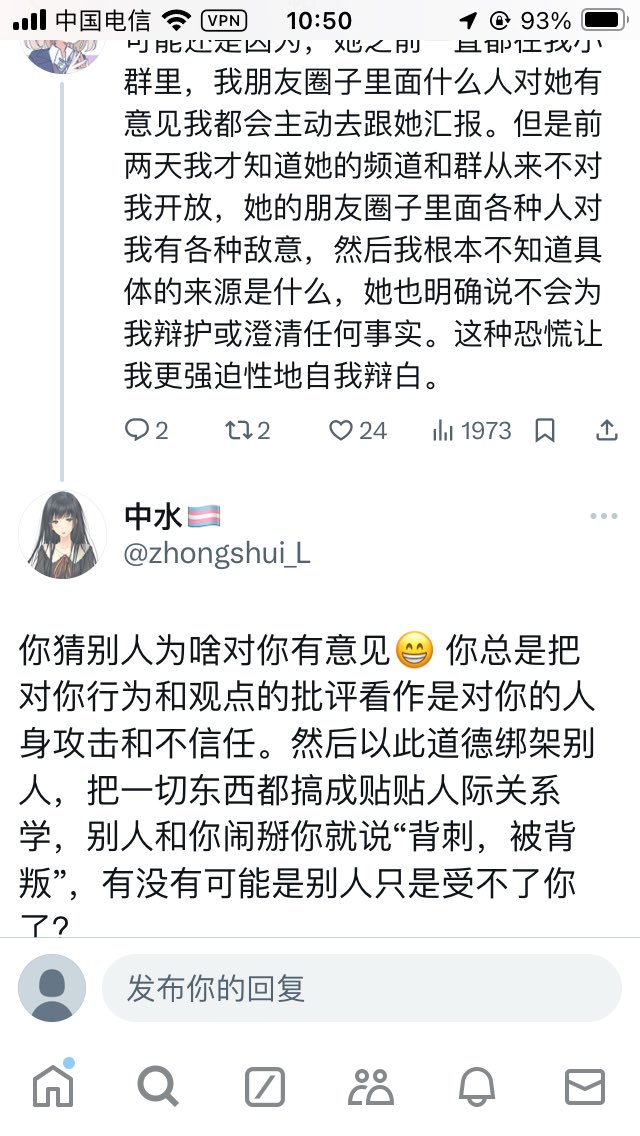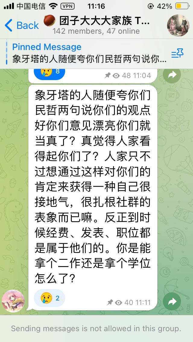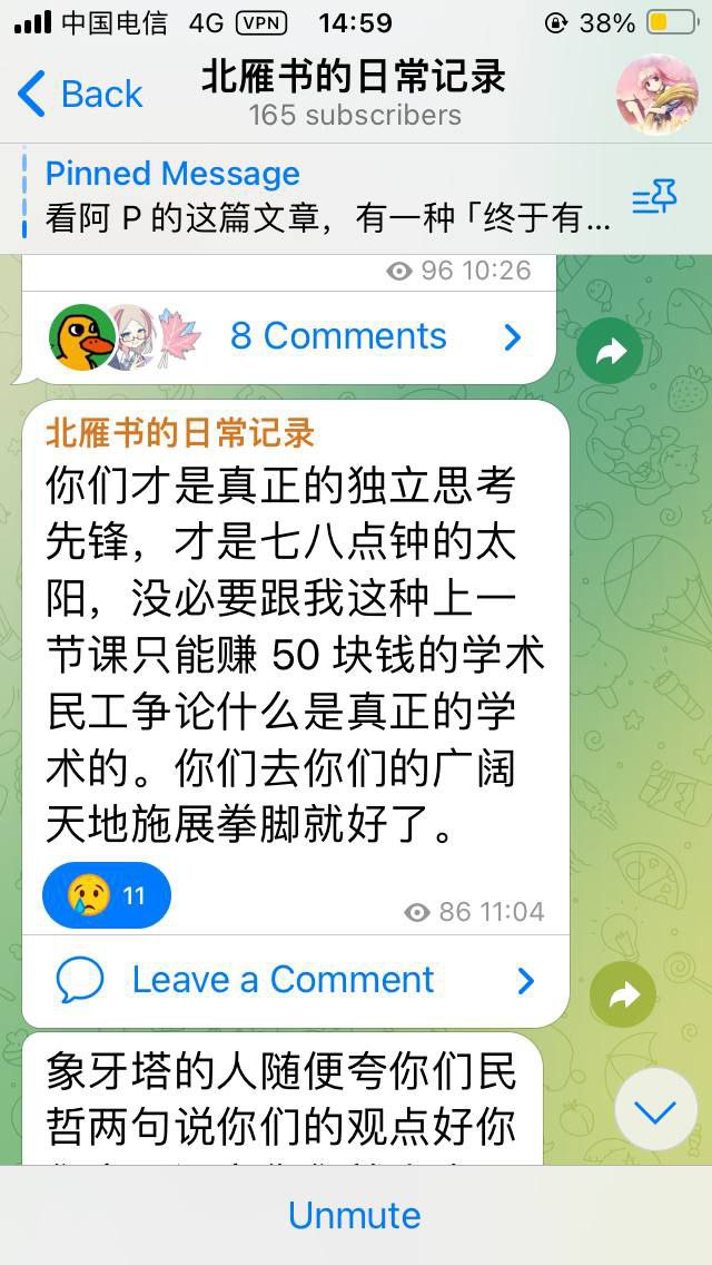 3、最近,我在书的推特下评论,表示难以忍受她公私不分公报私仇的作风,被她屏蔽。书在个人电报频道发出我的推文并配文“挂人”,但随后删除。(我不知道她更私密的电报频道有没有发,有没有删除,这是在她的公开频道发表后删除的)。